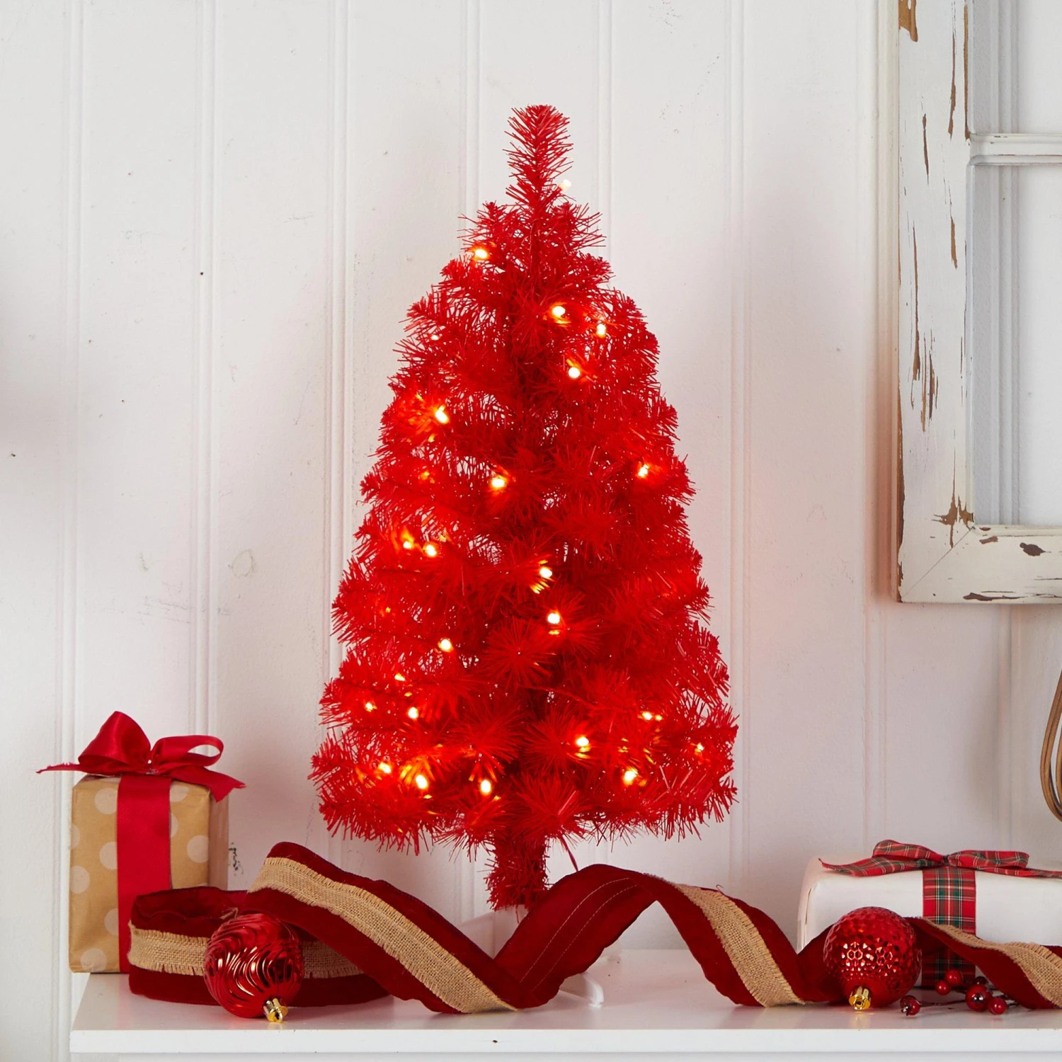 Be bold this holiday season with a vibrant Red Artificial Christmas Tree. Inspired by nature, this spicy red tree has PVC needles for housing ornaments. Accented with 35 energy-efficient LED lights, save time and money. Feel free to bend the lush, vibrant 72 bendable branches that ensure you’ll attract the eye of allβstanding 2′ from an accompanying stand (included in height), house in your favorite mini planter. Perfect for a desktop, office or mantel.