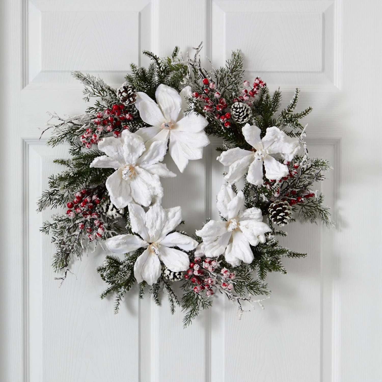 Magnolia blooms in winter? You can because it’s faux! This frosted magnolia wreath is complemented by green pine and red berry accents. Its perfect for a front door or hung on an interior wall to create a cheerful holiday focal point. Buy two and do both!