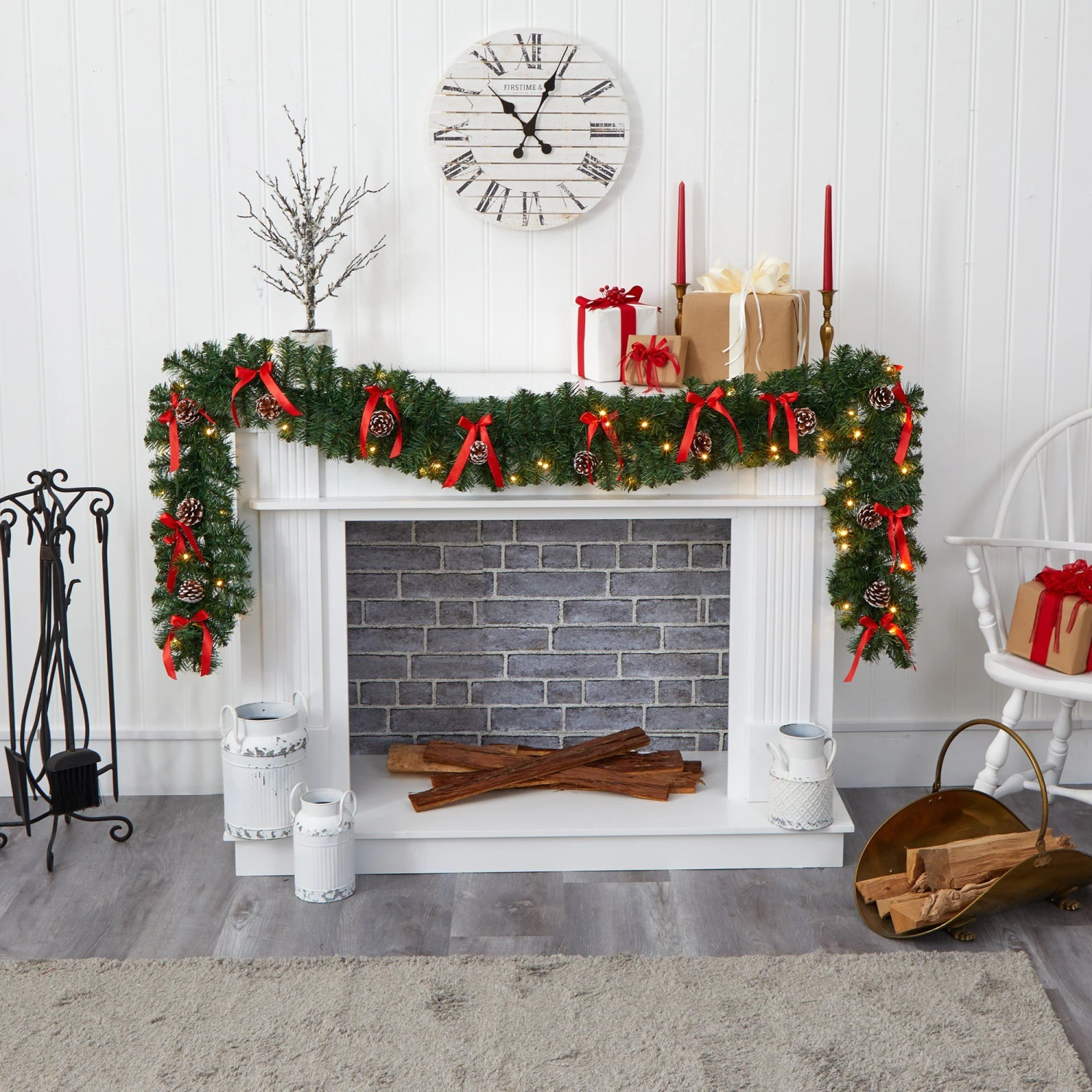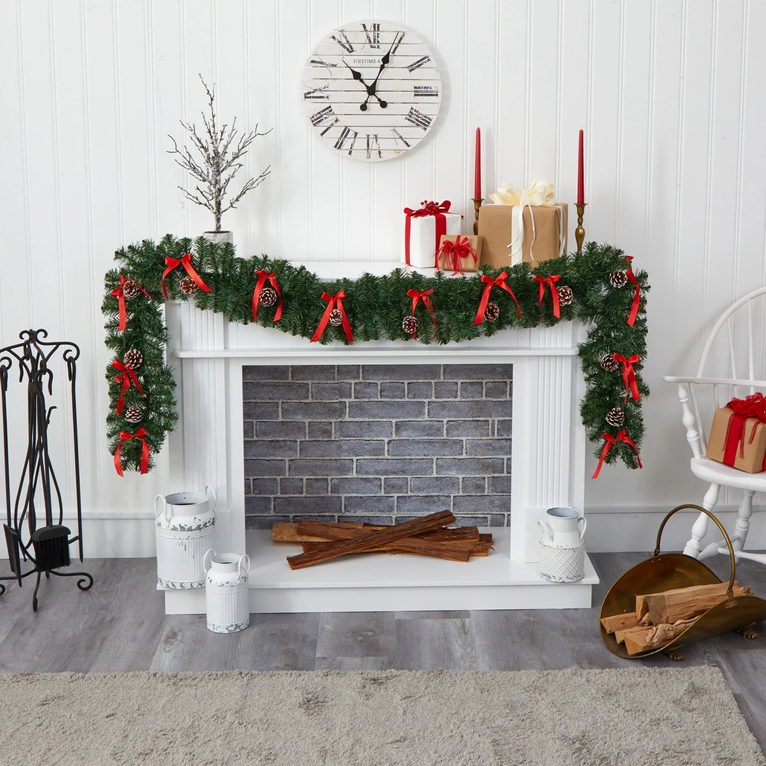 Complete your holiday decor scheme with this artificial winter garland, intricately designed from realistic looking foliage in a palette of seasonal evergreens and accented throughout with faux pinecones that look incredibly lifelike and decorative bows – all to help evoke the Christmas spirit. Great for showcasing over a mantle, bare counter, or stair banister, this festive 9’ long artificial garland will undoubtedly complete a traditional holiday setting for years to come.