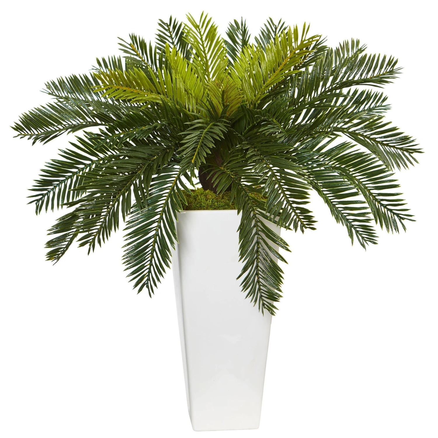 The green, full foliage of this artificial cycas form an umbrella of leaves that fall over the top of the white planter. The modern tall white planter comes with river rocks for a complete arrangement ready for your patio or deck. It also looks elegant and understated in your office or den.